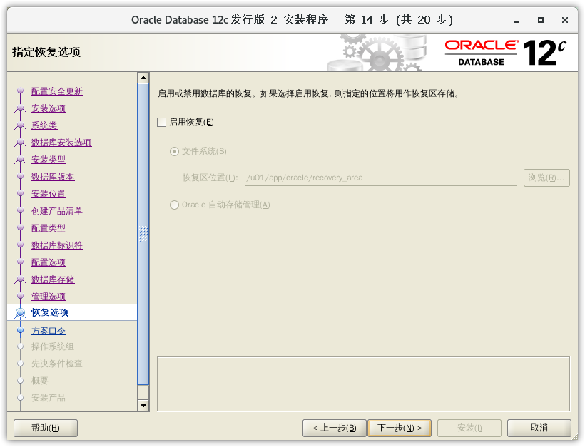 - 恢复选项,默认为不使用恢复,如果有需要,可以安装完成后配置,点击