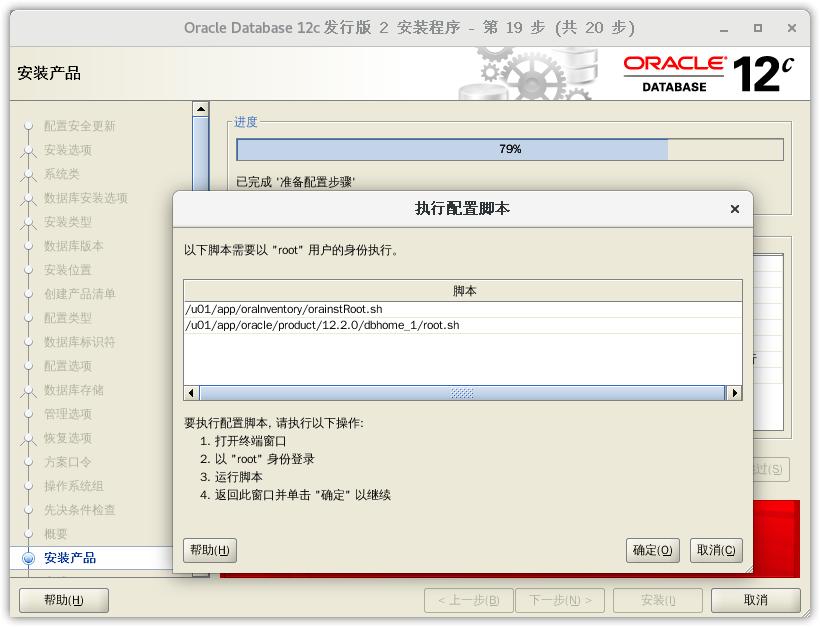 两个脚本都执行完成后,回到安装界面,点击 执行配置脚本 对话框中的 确定 继续进行安装。
